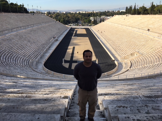 Tariq Mohammed’s visit to Panathenaic Stadium, Greece 2017. Photo credit: Unknown.