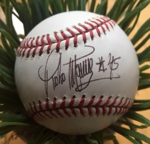 Pedro Martinez, Hall of Fame pitcher of the Boston Red Sox autographed baseball. Photo credit: T. Mohammed, 2017.
